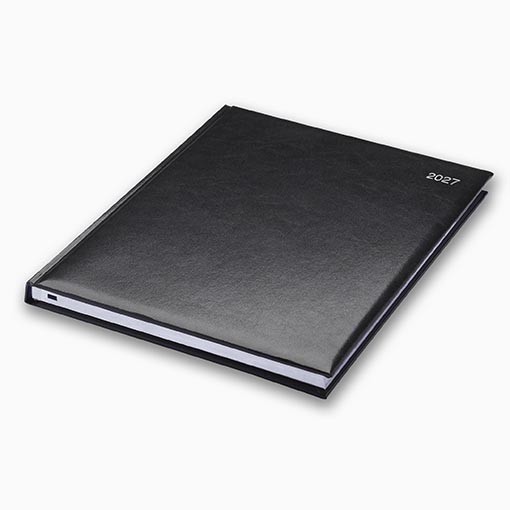 Printed in two colours, the diary has 160 pages with dimensions of 260 x 210mm. It is section sewn with head and tail bands. It is available in black, blue, burgundy, green, mid-blue or red.
